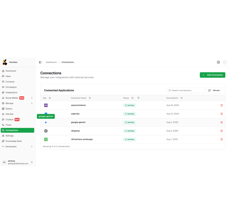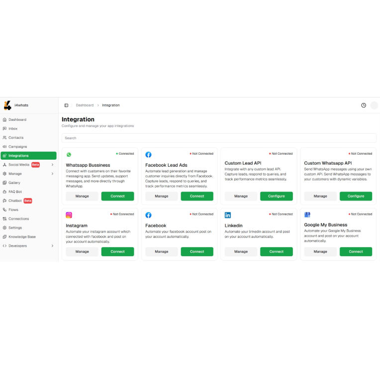 i4whats connects effortlessly with the tools you already use, bringing all your customer conversations into one place. From CRMs and helpdesks to marketing platforms and payment gateways, our integrations eliminate manual work and ensure your business runs smoothly. With everything synced in real time, you can deliver faster responses, maintain better customer records, and create a unified experience across every touchpoint.
